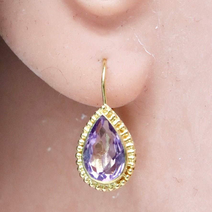 The romantic sentiments in Elizabeth Barrett Browning's lyrical poetry are embodied in these teardrop-shaped gemstones with their antique Victorian design. 14k solid gold paired with faceted amethyst. European backs for pierced ears. Size: 11/16th Inches tall.