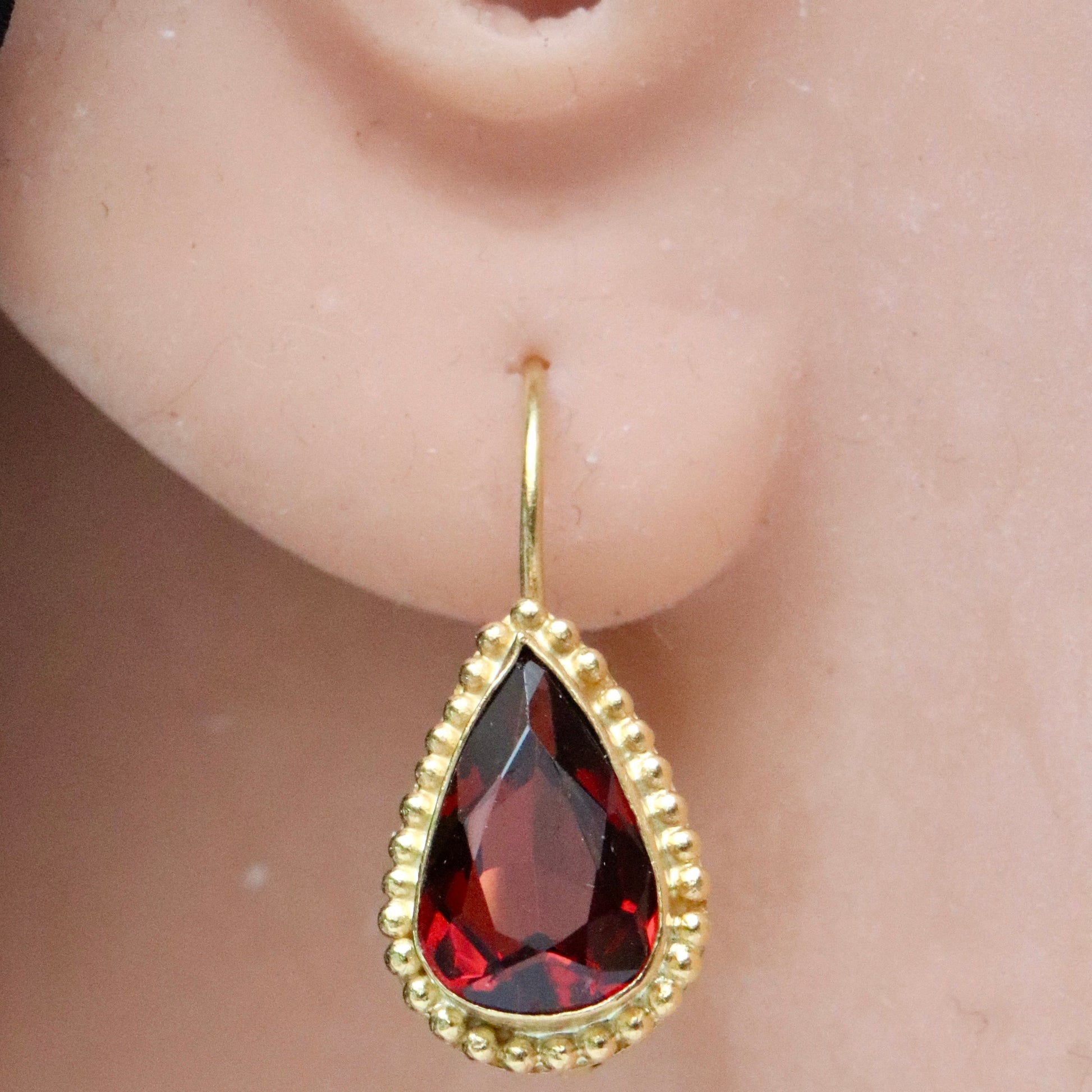The romantic sentiments in Elizabeth Barrett Browning's lyrical poetry are embodied in these teardrop-shaped gemstones with their antique Victorian design. 14k solid gold paired with faceted garnet.? Lever?backs for pierced ears. Size: 11/16th Inches tall.