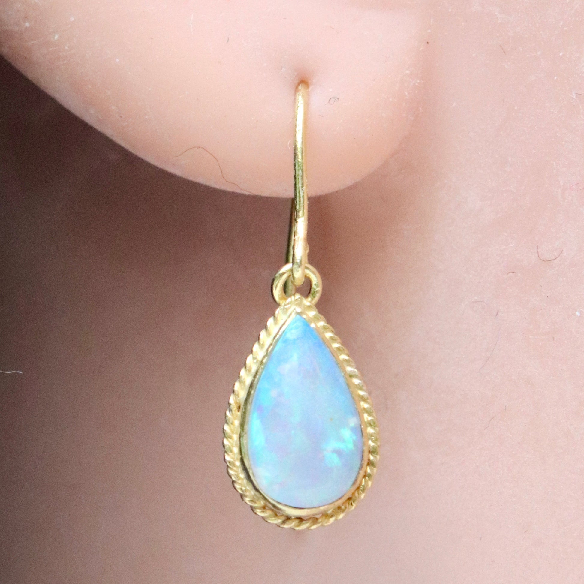 The romantic sentiments in Elizabeth Barrett Browning's lyrical poetry are embodied in these teardrop-shaped gemstones with their antique Victorian design. 14k solid gold paired with Australian fire opal. Hook backs for pierced ears. Size: 7/8 Inch.