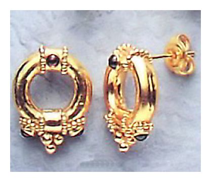 Roman designs were known for their simplicity and harmony. In this antique reporduction, circlets of 14k gold are decorated by three cabochon garnets mounted in regal filigree and granule settings. Post backs for pierced ears.