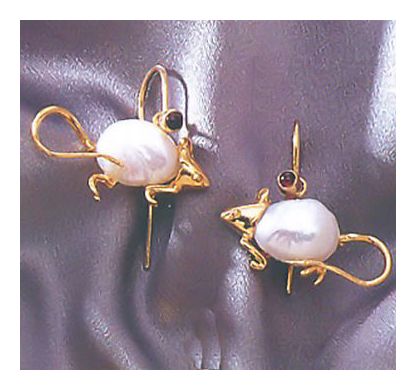 Cultured pearl mice make a playful gift for anyone with a sense of humor. 14k gold; garnet-accented hoop backs.
