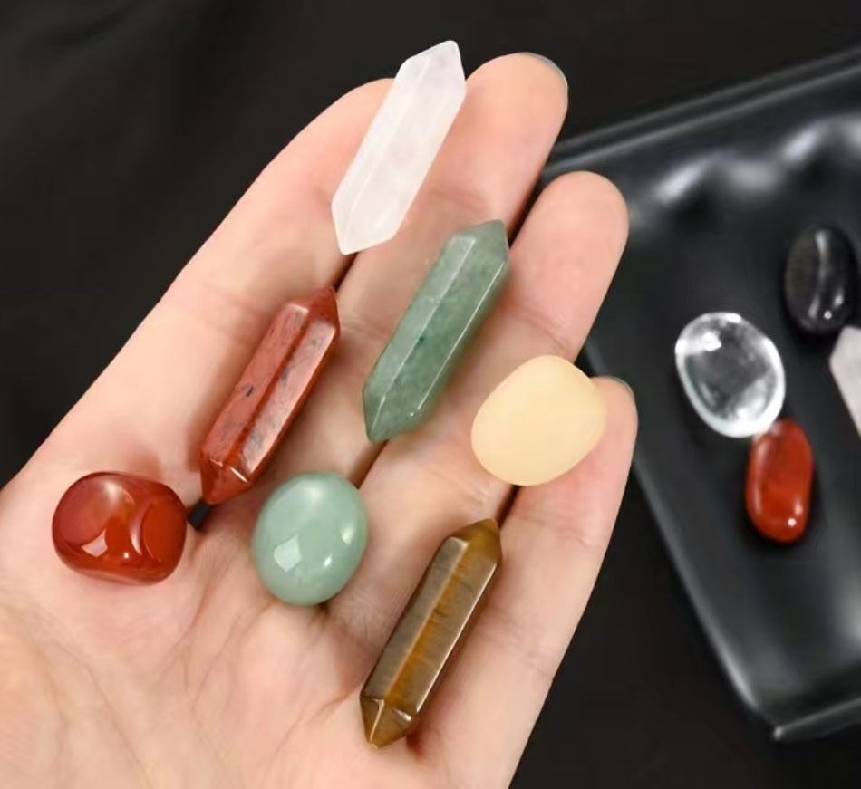 Style A--Amethyst, White crystal, Green aventurine, Red jasper, Rose crystal, Tiger's eye, Lapis lazuli, yellow jade, sodalite,red agate; Style B--Artificial cat's eye stone, Amethyst, White crystal, Green aventurine, Red jasper, Yellow jade, Lapis lazuli, Red agate;