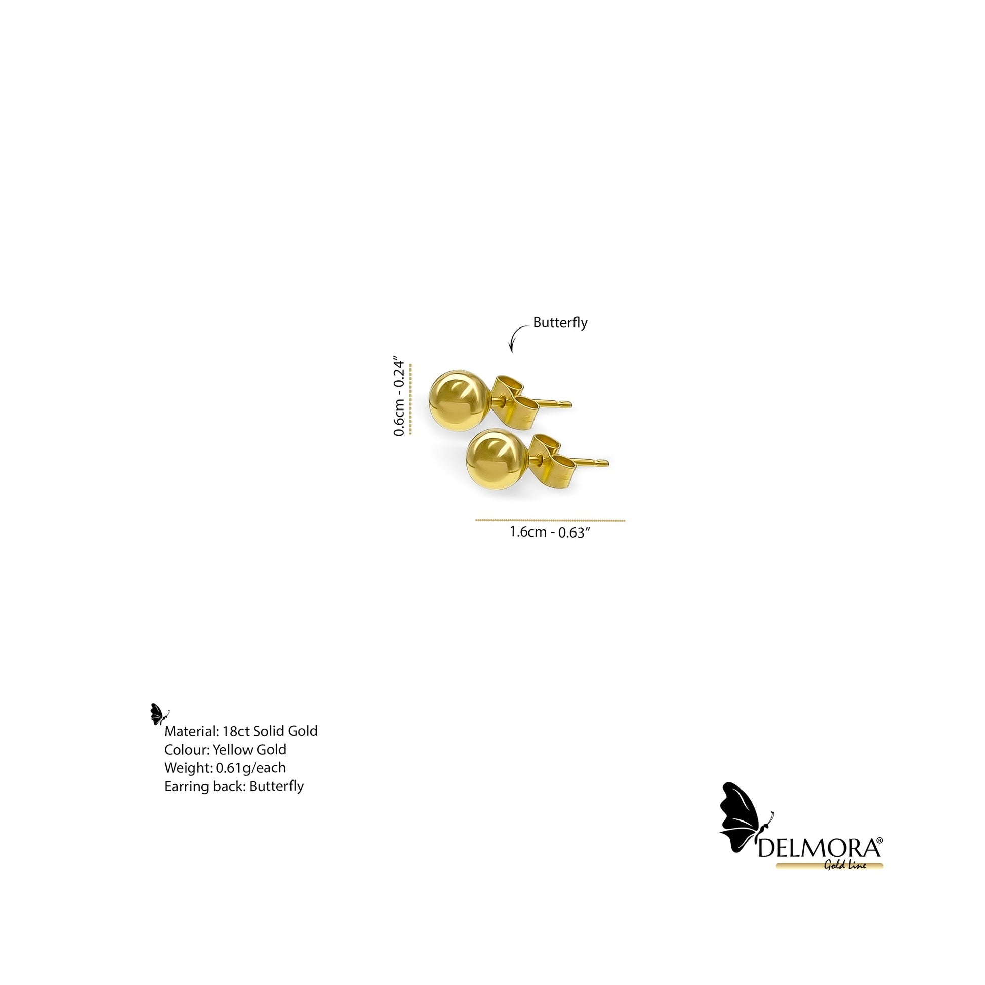 18ct Solid Gold 6mm Ball Stud Earrings