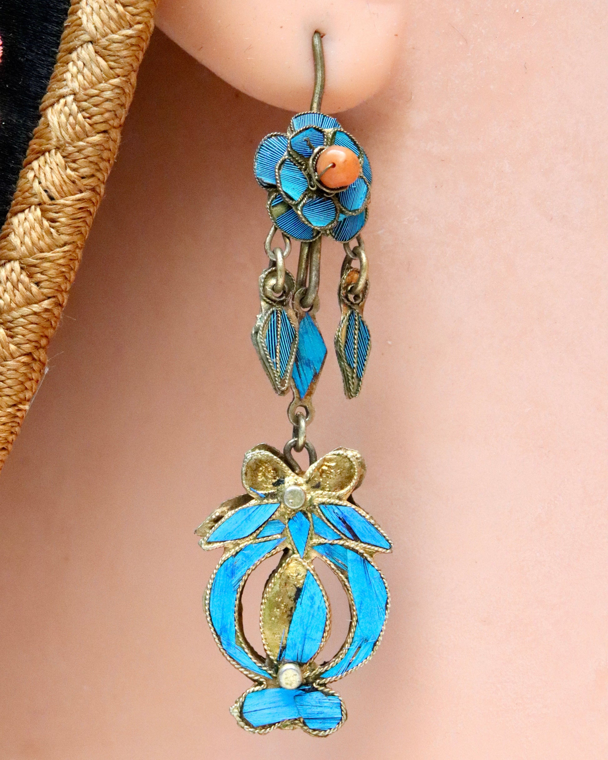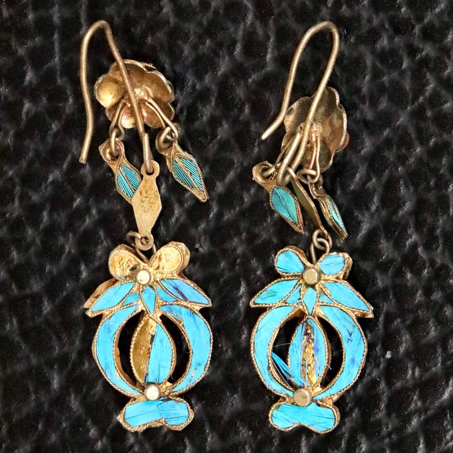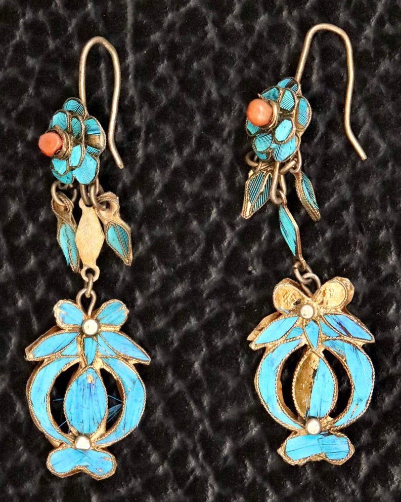 Antique stock, made by hand in the late 19th or early 20th century. Gilded silver with kingfisher feather (tian-tsui) finish. 2 inches tall with french hook ear wires.