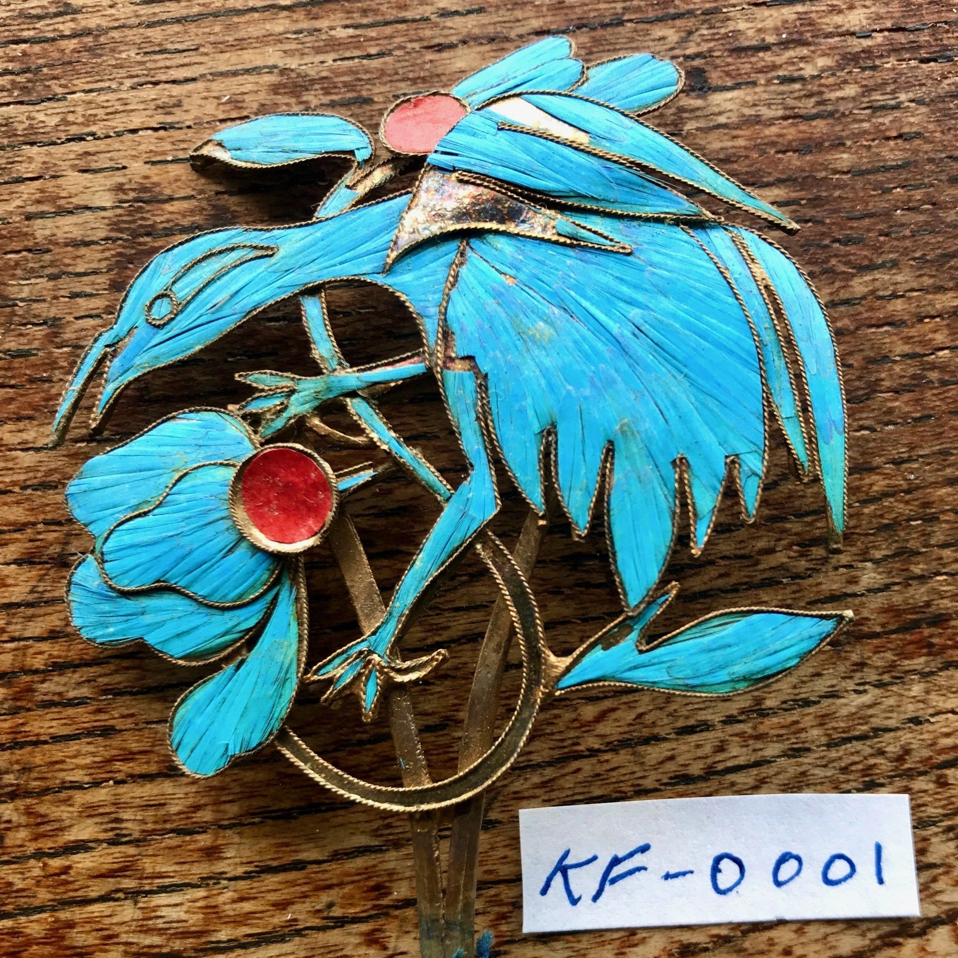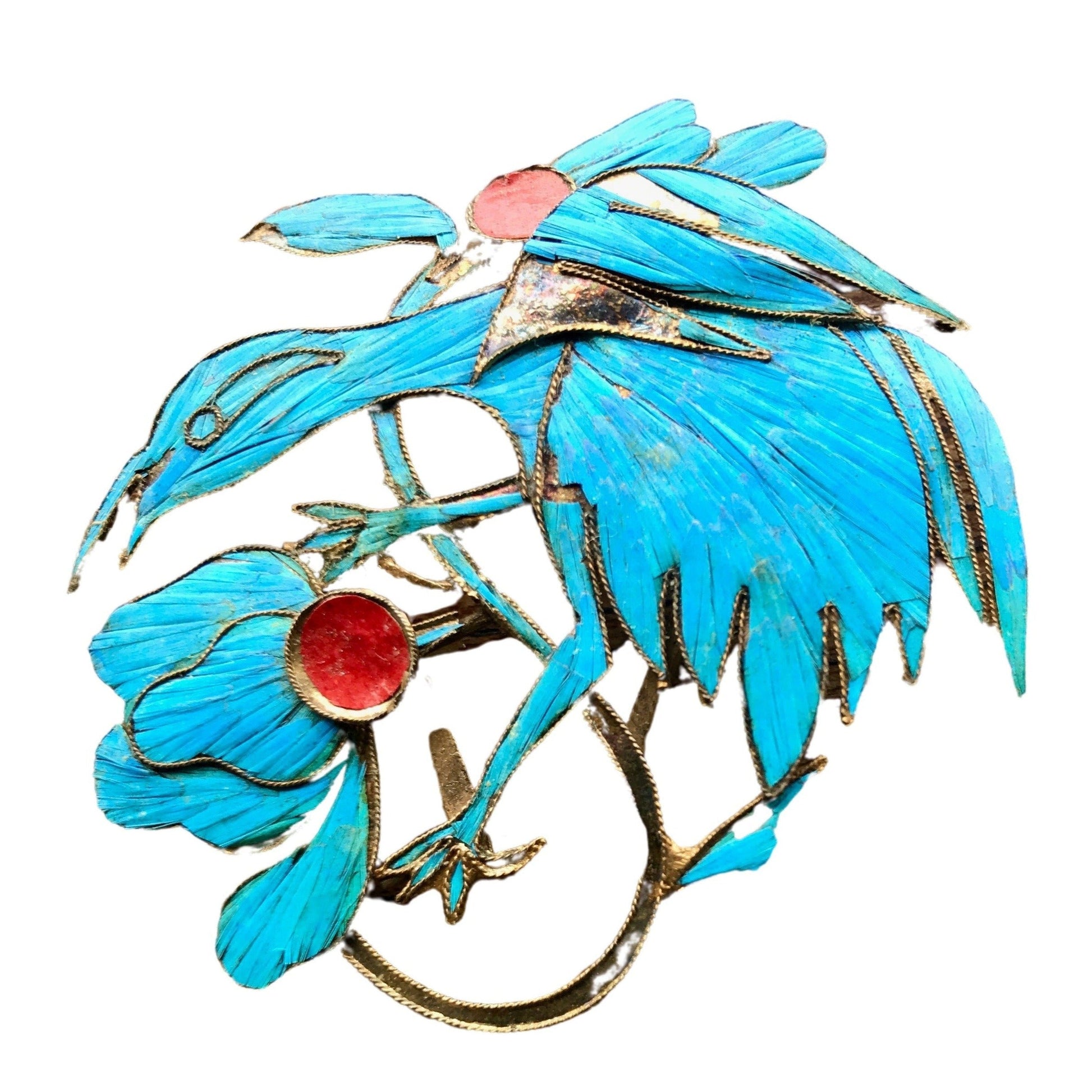Known as üc´ä / µã´ä to the Chinese, Tian-Tsui translates to dotting with kingfishers. Its a traditional practice in which tiny kingfisher feathers were cut to size and incorporated into sterling silver and silver gilt jewelry to create a dazzling fluorescent blue finish. The technique was lost with the Chinese cultural revolution in the 1940's.