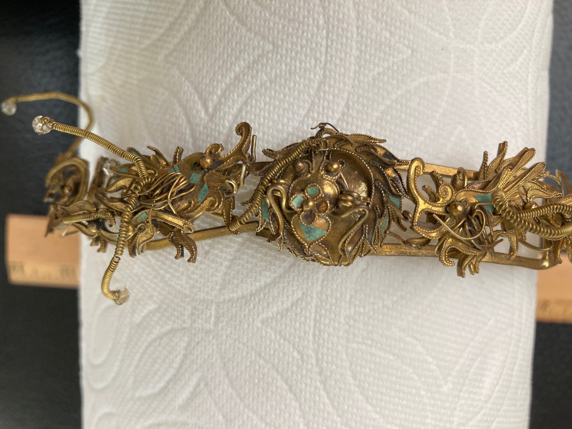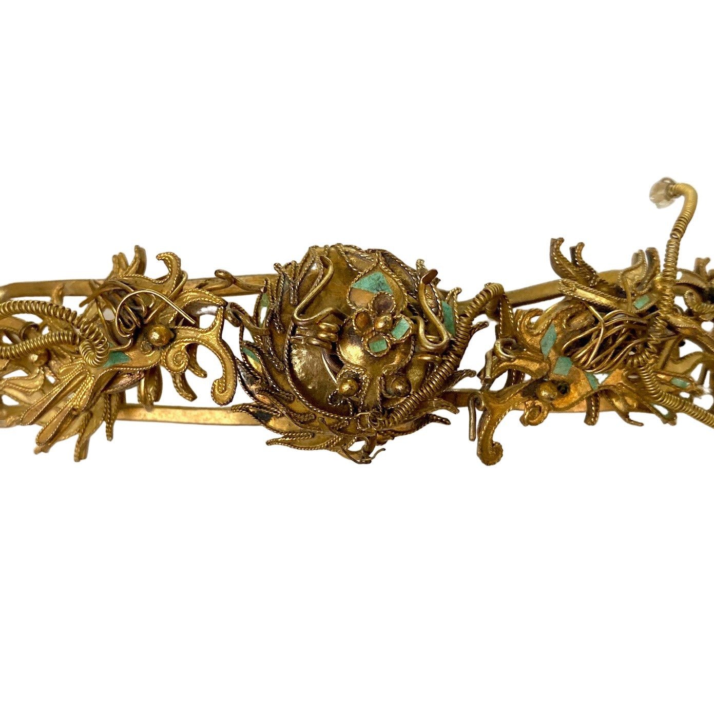 This type of jewelry was made for over 2000 years in China. The techniques were largely lost with the Chinese cultural revolution in the 1940s. This tiara is an antique which was made by hand in the first half of the 20th century.