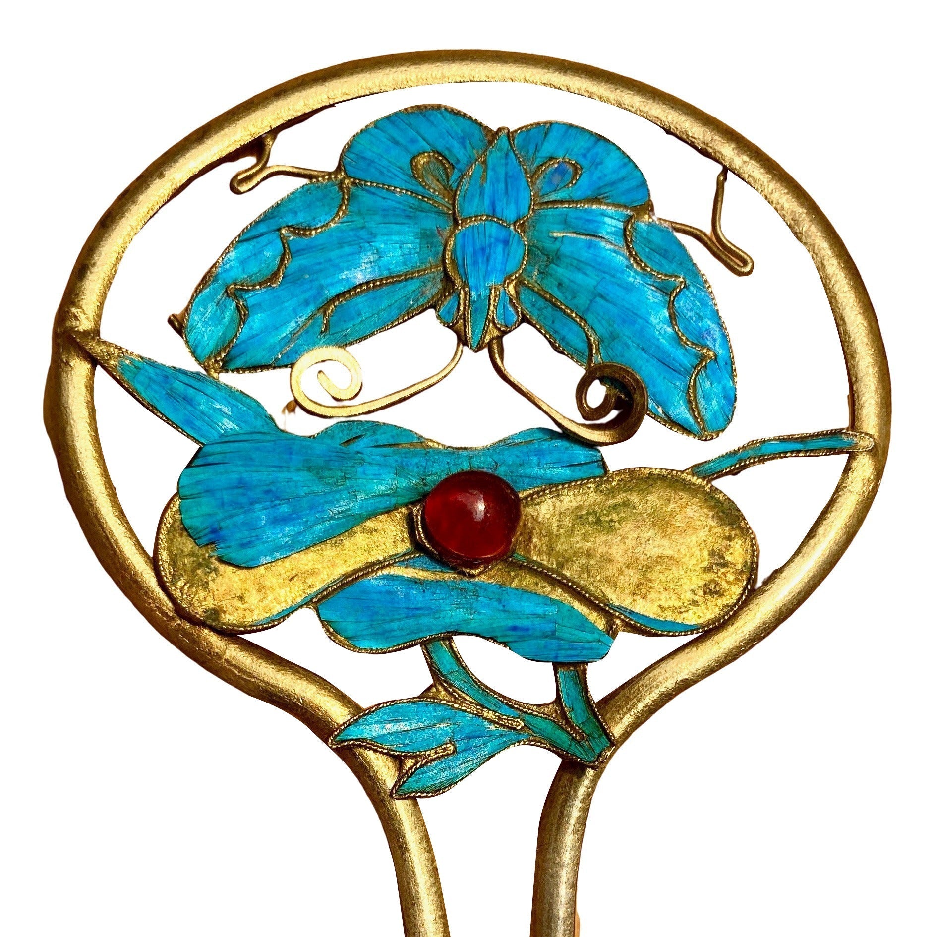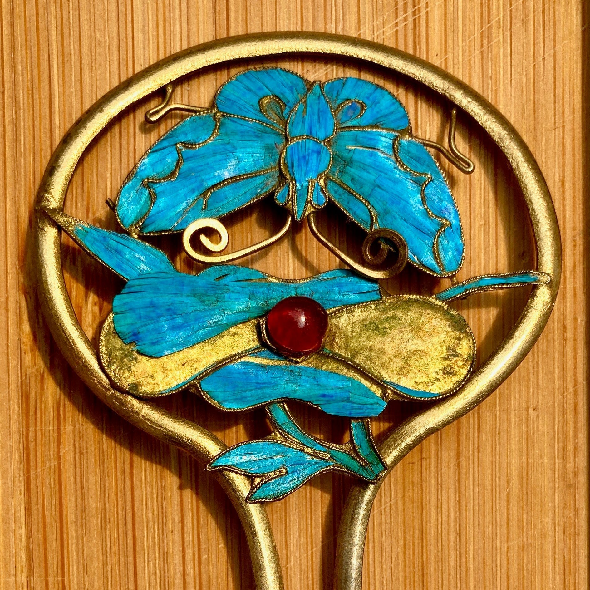 Known as üc´ä / µã´ä to the Chinese, Tian-Tsui translates to dotting with kingfishers. Its a traditional practice in which tiny kingfisher feathers were cut to size and incorporated into sterling silver and silver gilt jewelry to create a dazzling fluorescent blue finish. The technique was lost with the Chinese cultural revolution in the 1940's.
