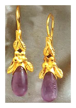 This whimsical Victorian design features amethysts stones which are said to hold the power to lift the spirits. 24k gold over sterling silver setting, with hoop backs. Size: 1 1/2 Inches.