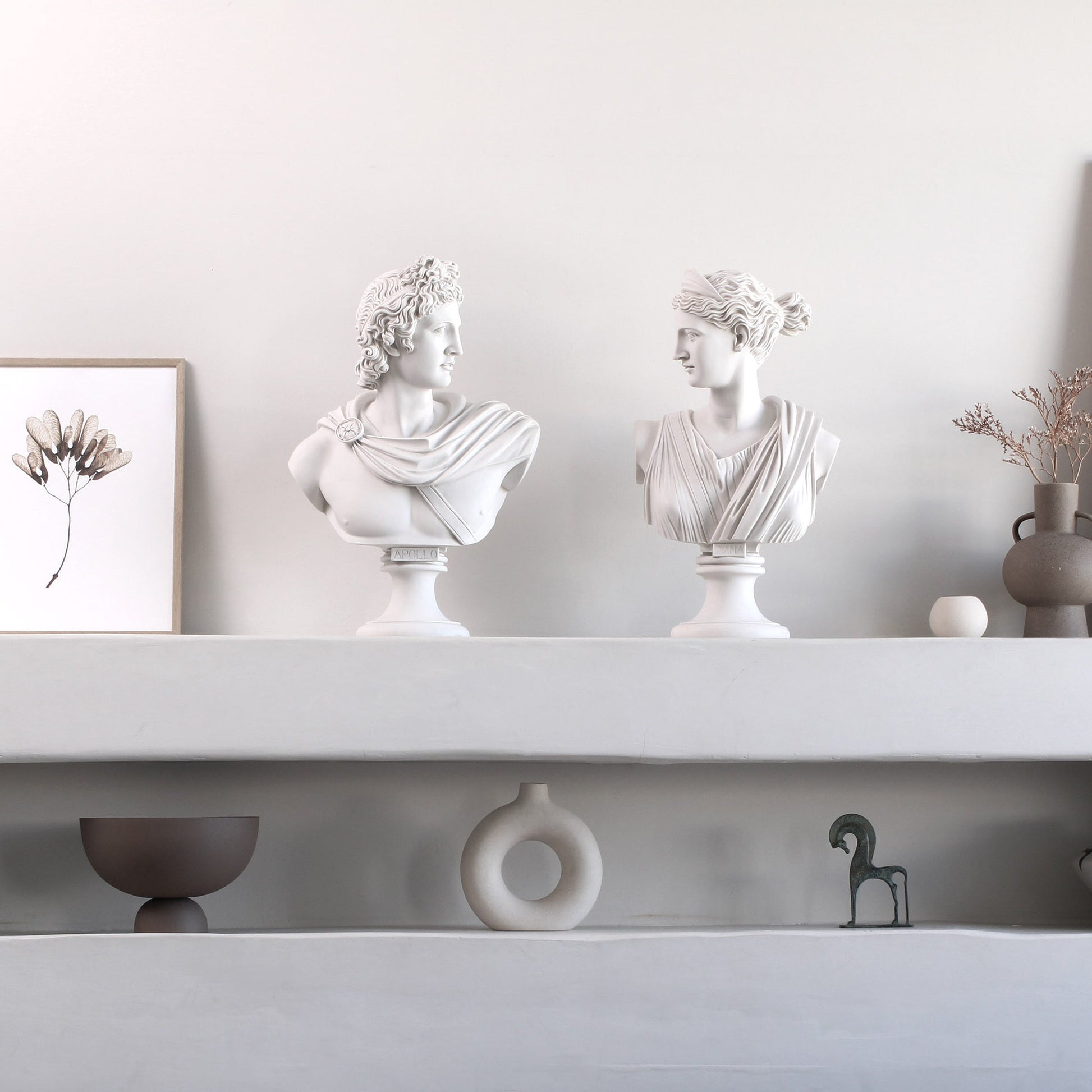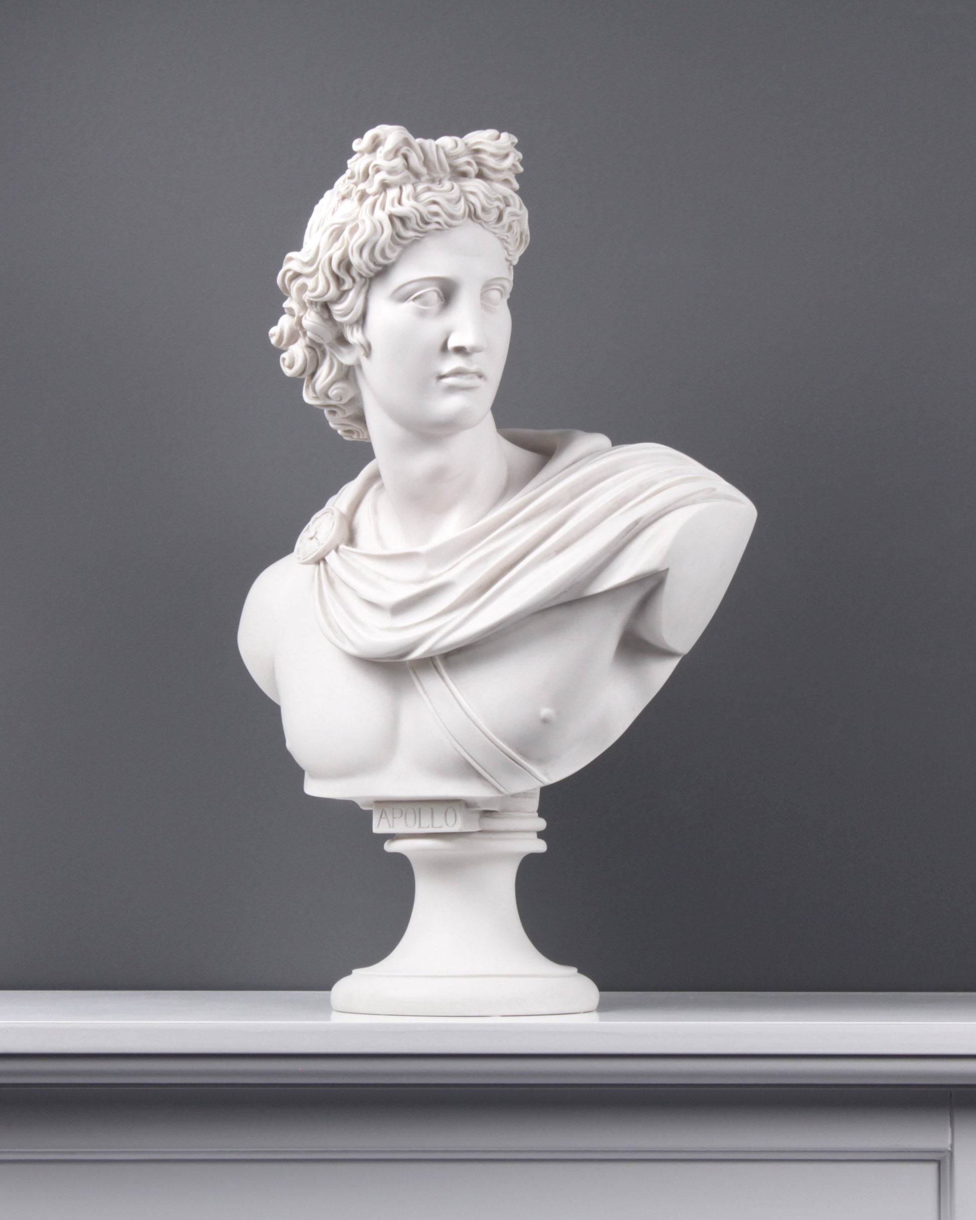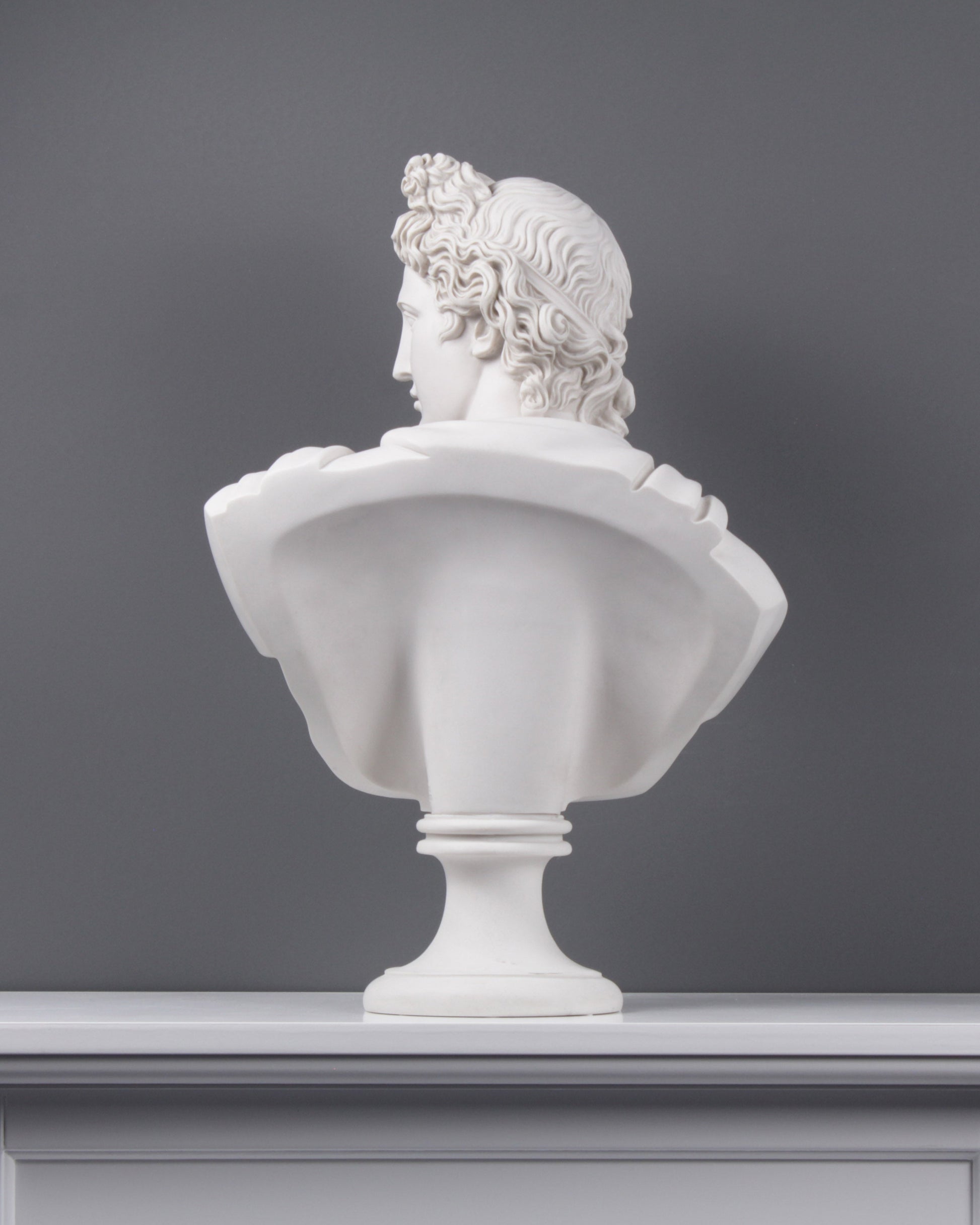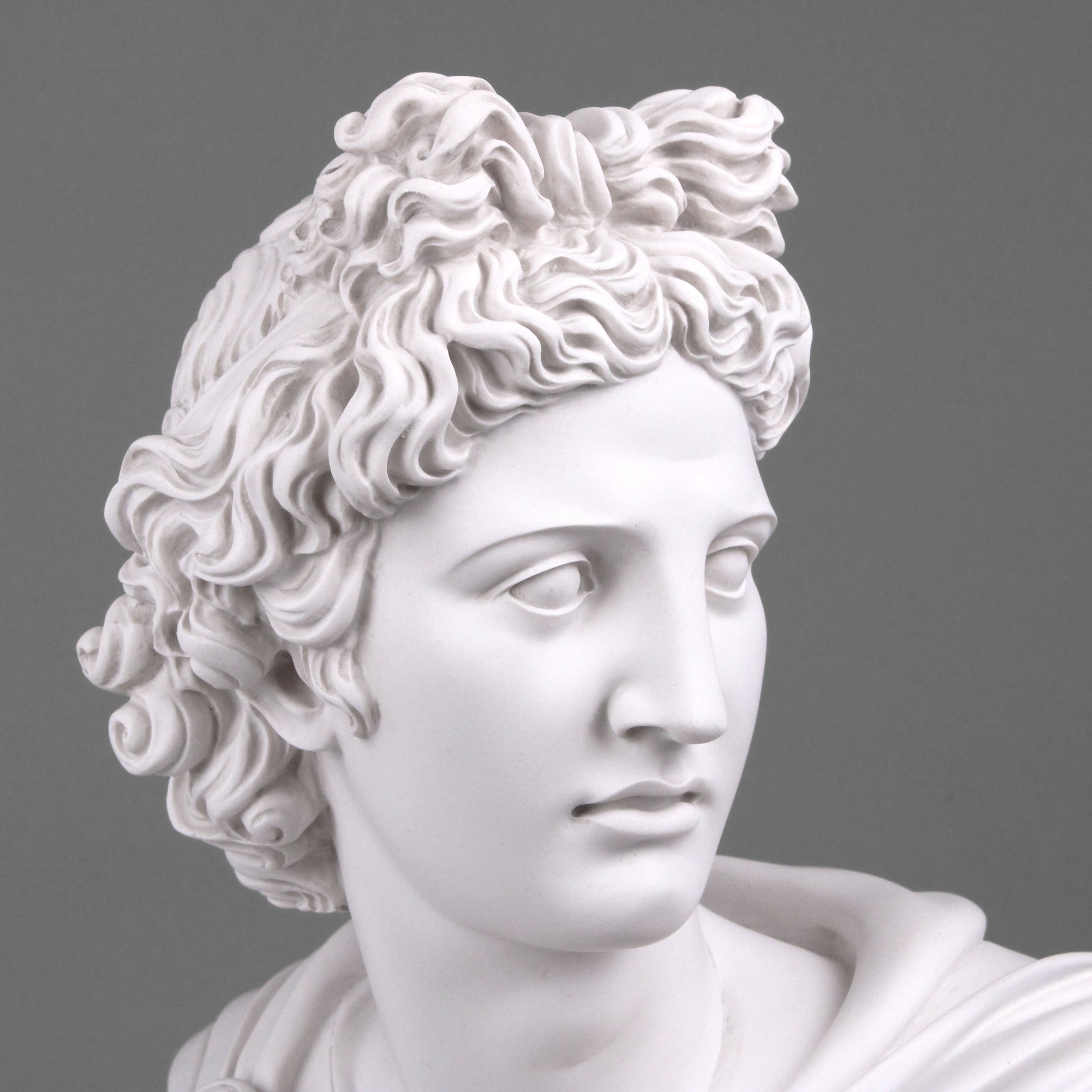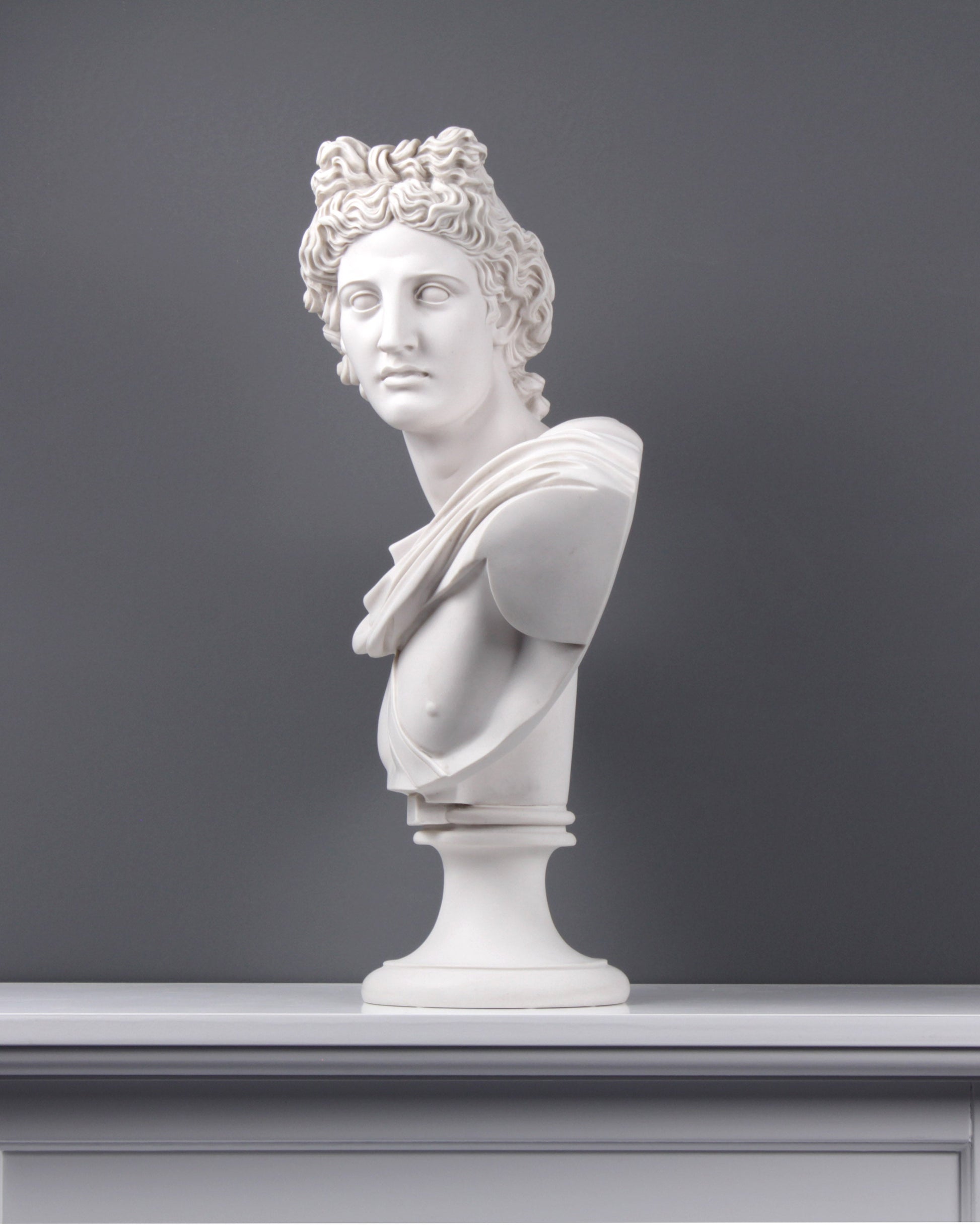 Our Large Apollo Bust is a reduced reproduction of the Italian antique version from 1780 of Apollo Belvedere. The Roman marble statue from c. 120-140 can be seen in the Vatican Museums and is thought to be a copy of a Greek original from BC 350-325 made of bronze by Leochares. The famous Diana of Versailles statue or so called Diana Chasseresse is a Roman copy of the Greek original by Leochares as well. It is well-known that Apollo and Diana (or Artemis in Greek mythology) were twins, children of Zeus and Leto. Consequently our Apollo Bust coupled with our results in a breathtaking and harmonious interior attracting the attention of anyone who enters the room.