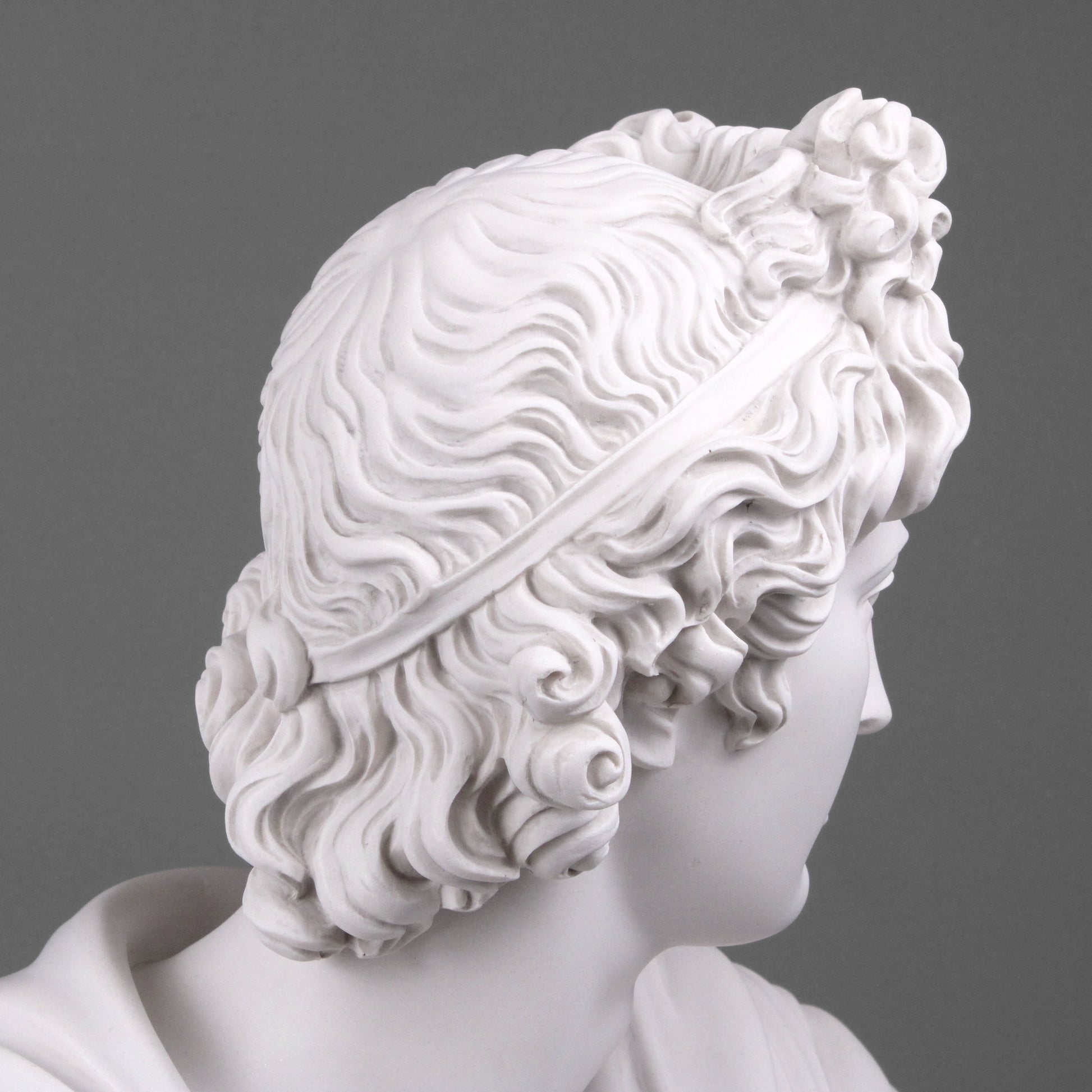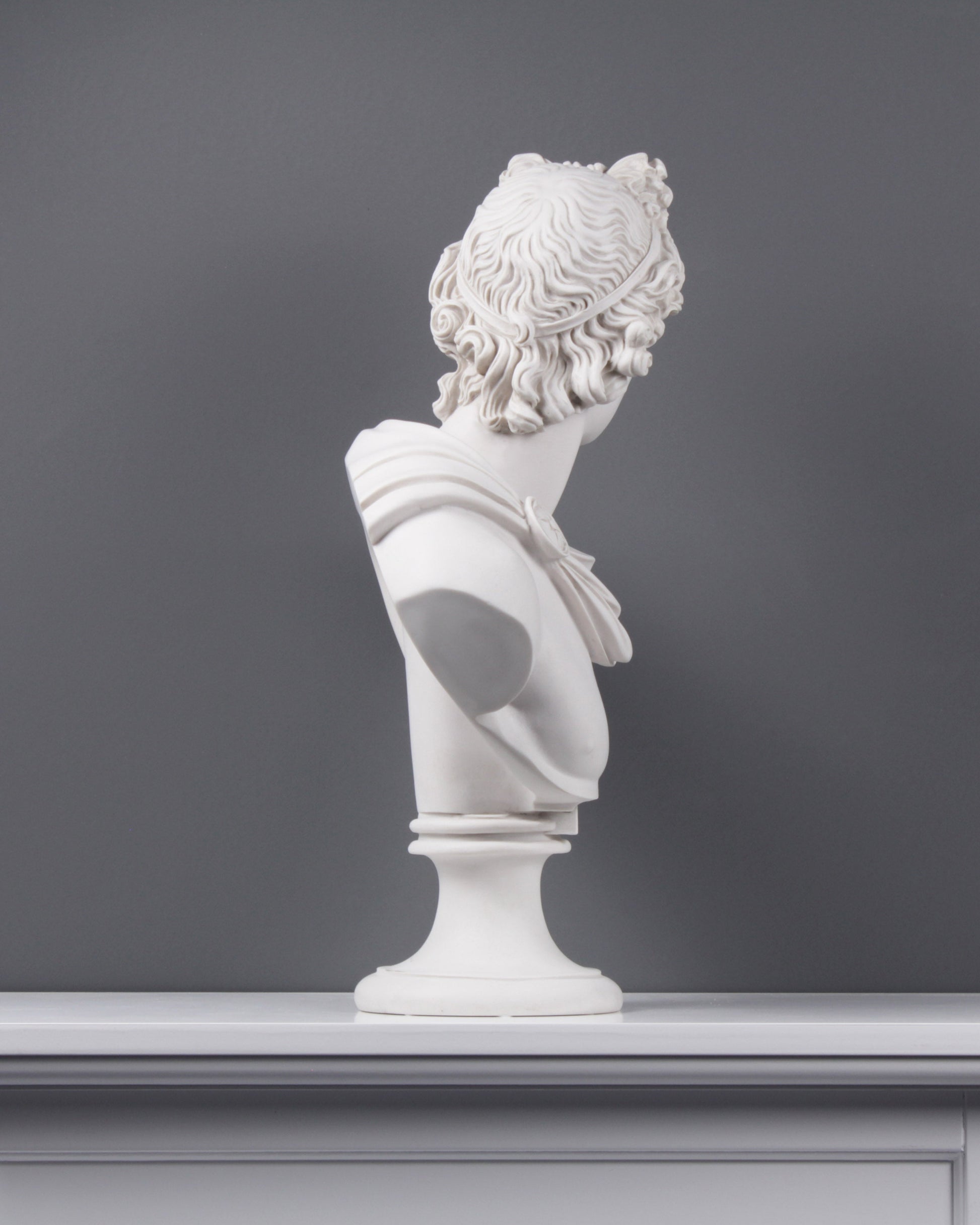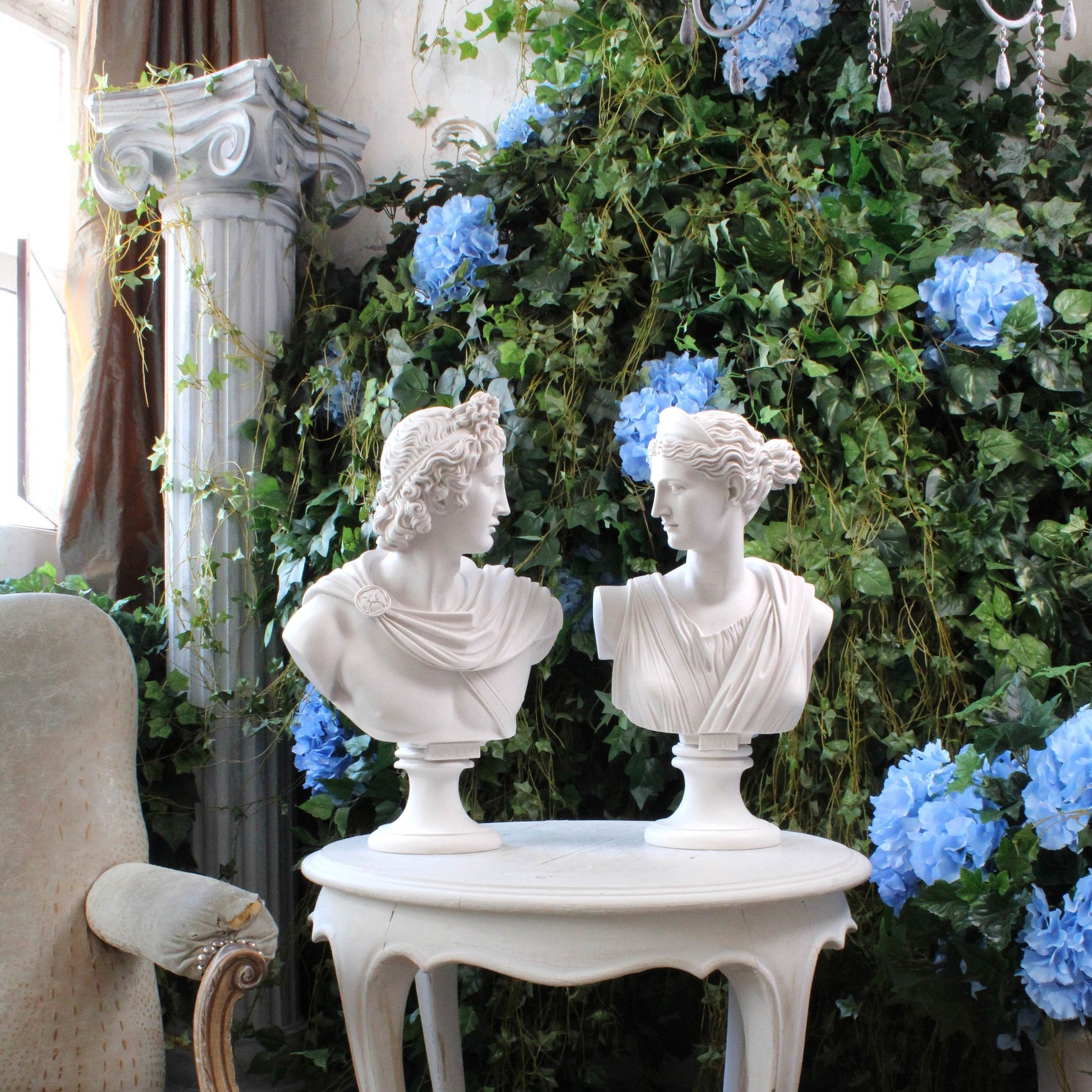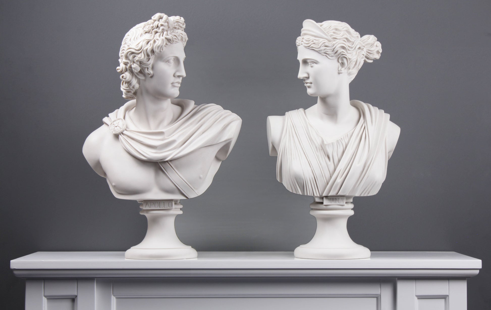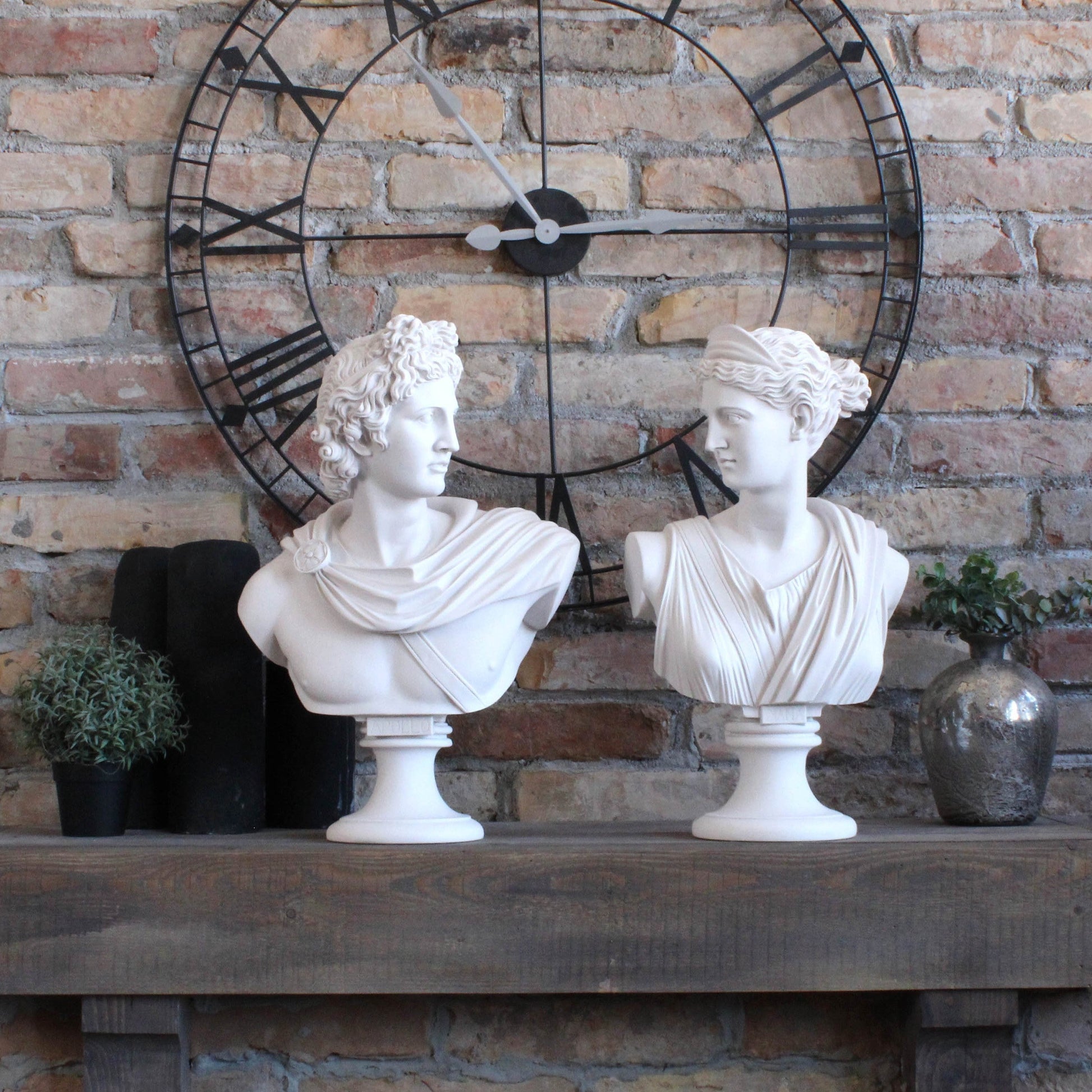 Our Large Apollo Bust is a reduced reproduction of the Italian antique version from 1780 of Apollo Belvedere. The Roman marble statue from c. 120-140 can be seen in the Vatican Museums and is thought to be a copy of a Greek original from BC 350-325 made of bronze by Leochares. The famous Diana of Versailles statue or so called Diana Chasseresse is a Roman copy of the Greek original by Leochares as well. It is well-known that Apollo and Diana (or Artemis in Greek mythology) were twins, children of Zeus and Leto. Consequently our Apollo Bust coupled with our results in a breathtaking and harmonious interior attracting the attention of anyone who enters the room.