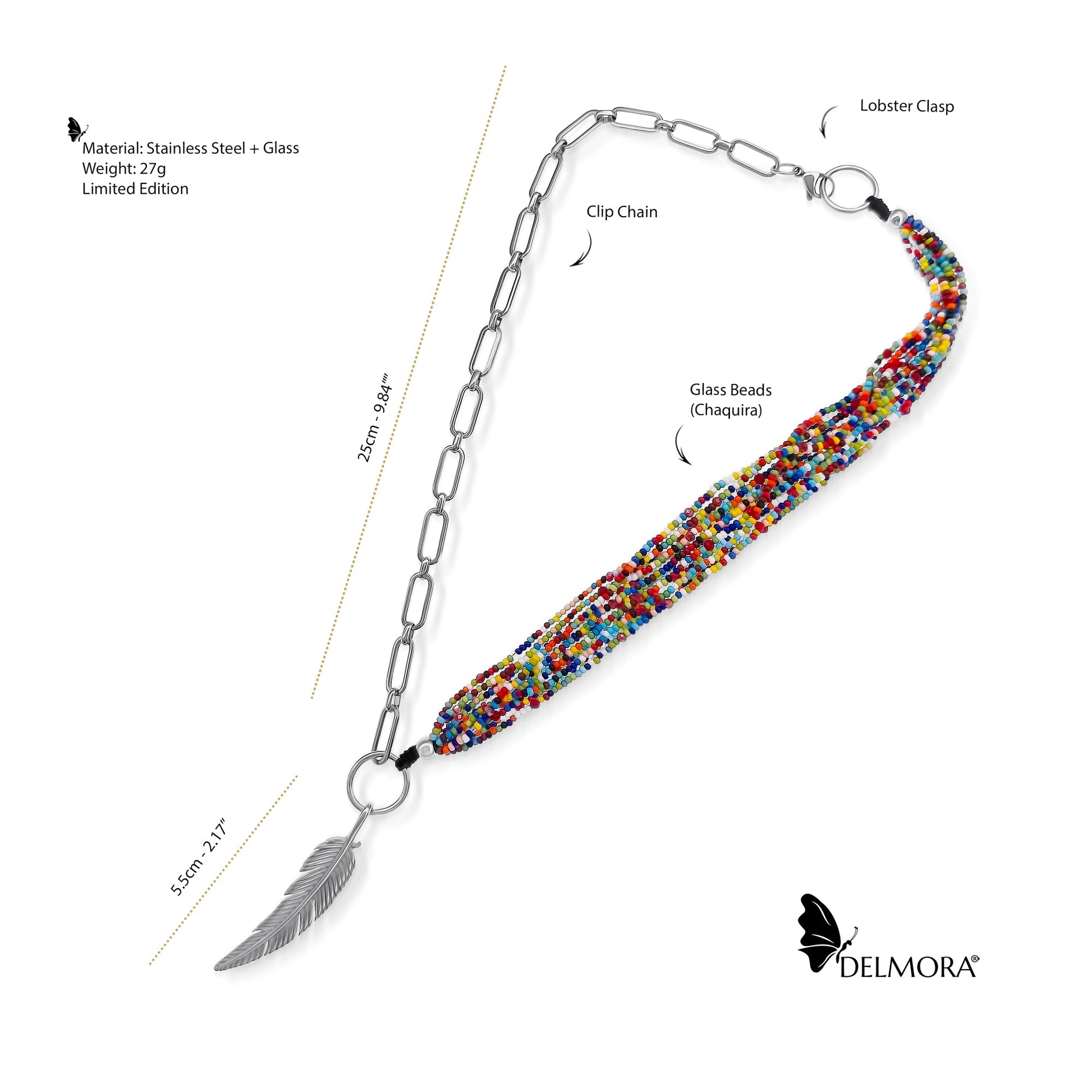 This limited-edition choker combines a beautiful metal chain with glass beads, best known in Colombia as Chaquiras. It can be worn every day and can be combined with any clothing colour.