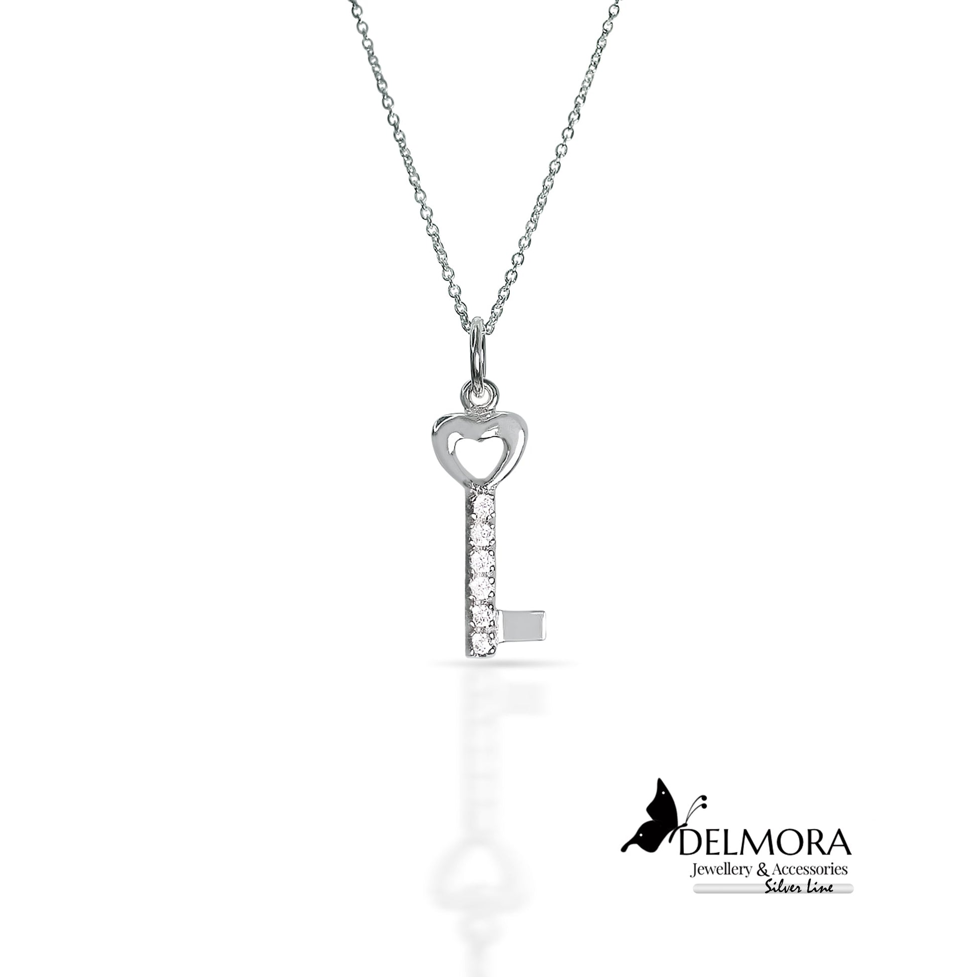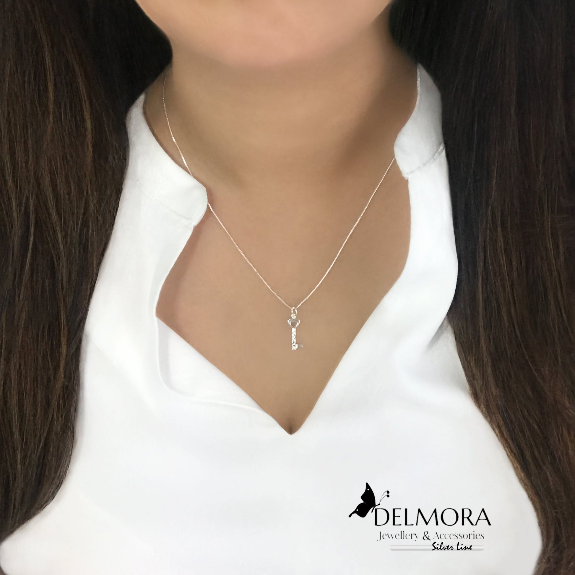 This delicate necklace has a key-shaped pendant and 2 chain options: Cable and Box. The chains have an extension of 2.5 cm.